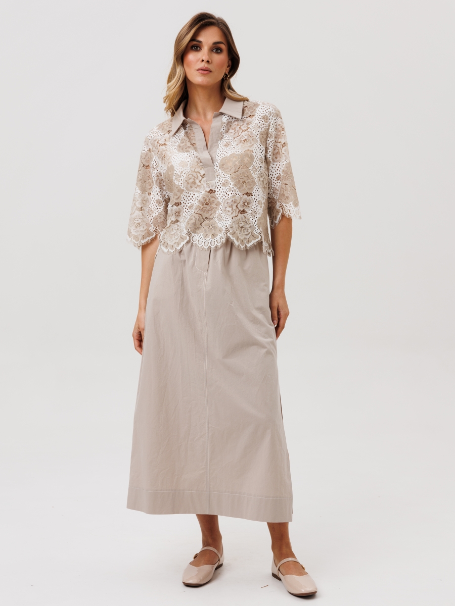 Блузка прямого силуэта с воротником поло из легкого кружева. Воротник и планка выполнены из отделочной ткани. Рукав втачной одношовный.