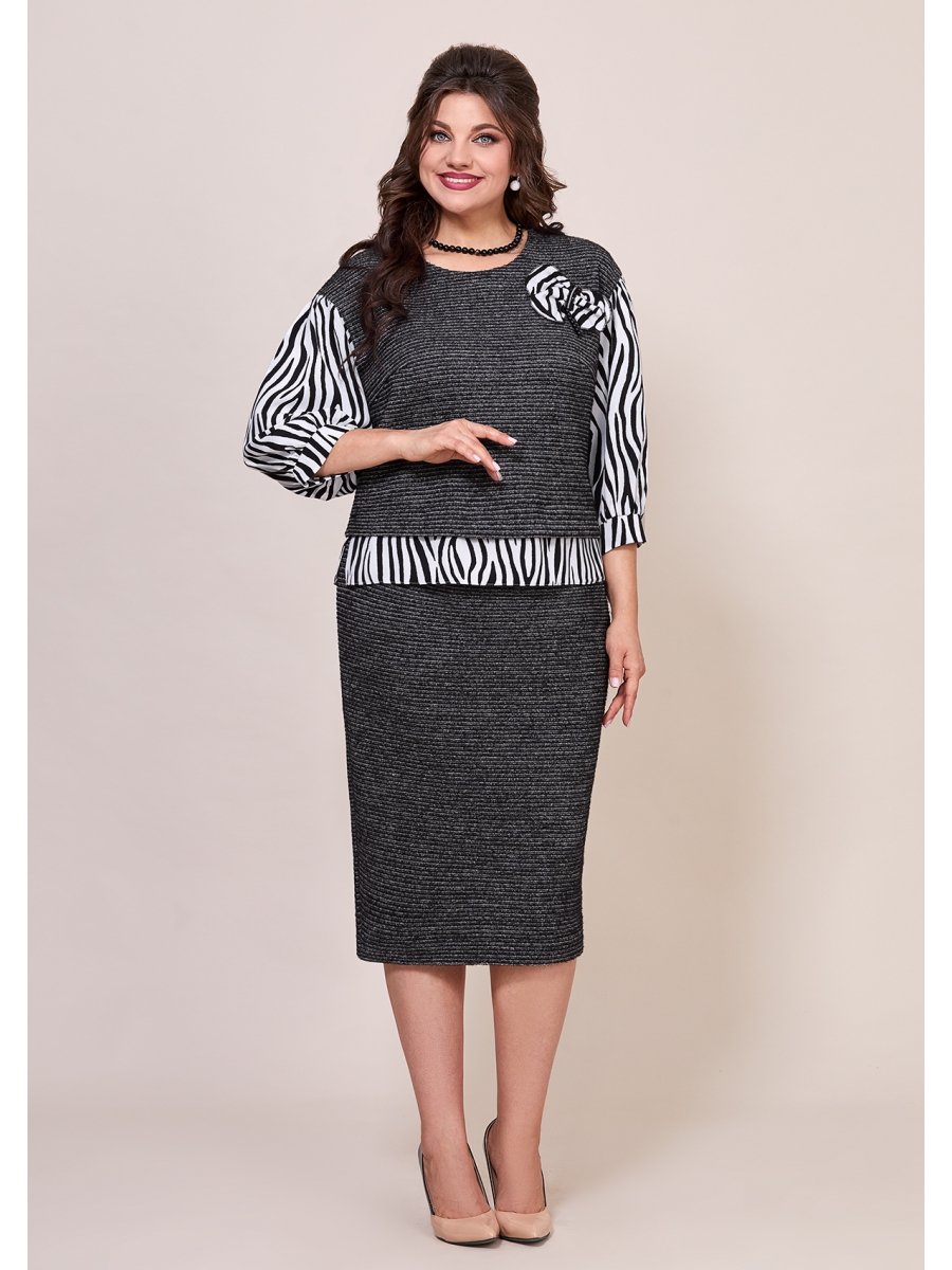 Женское платье полу-прилегающего силуэта, выполнено из вискозной ткани с принтом. Горловина округлой формы, обработана стойкой, застежка по переду на планку с пуговицами. На полочке обработаны защипы и рельефы с вставками воланов из основной ткани, в боковых швах карманы. Спинка идентична полочке, с защипами по верху, рельефами и вставками воланов.