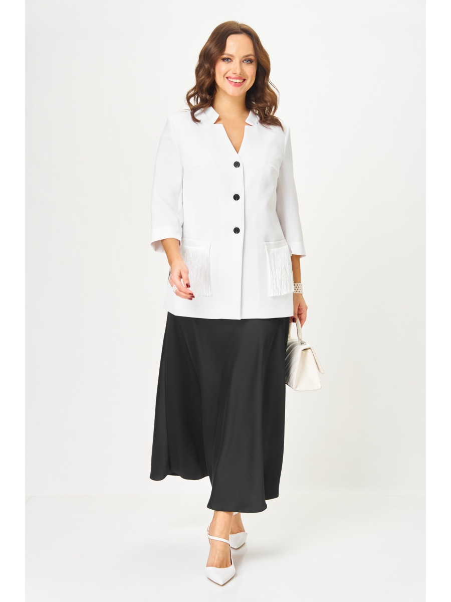 Жакет полуприлегающего силуэта из однотонной плательно-костюмной ткани, перед изделия на подкладке, центральная застежка на петли и пуговицы. Спинка со средним швом и вертикальными рельефами из проймы. По переду нагрудные вытачки, функциональные карманы с листочкой, декорированные тесьмой, в боковых швах разрезы. Горловина фигурной формы с плосколежащей стойкой. Рукав втачной двухшовный 3/4 длиной.