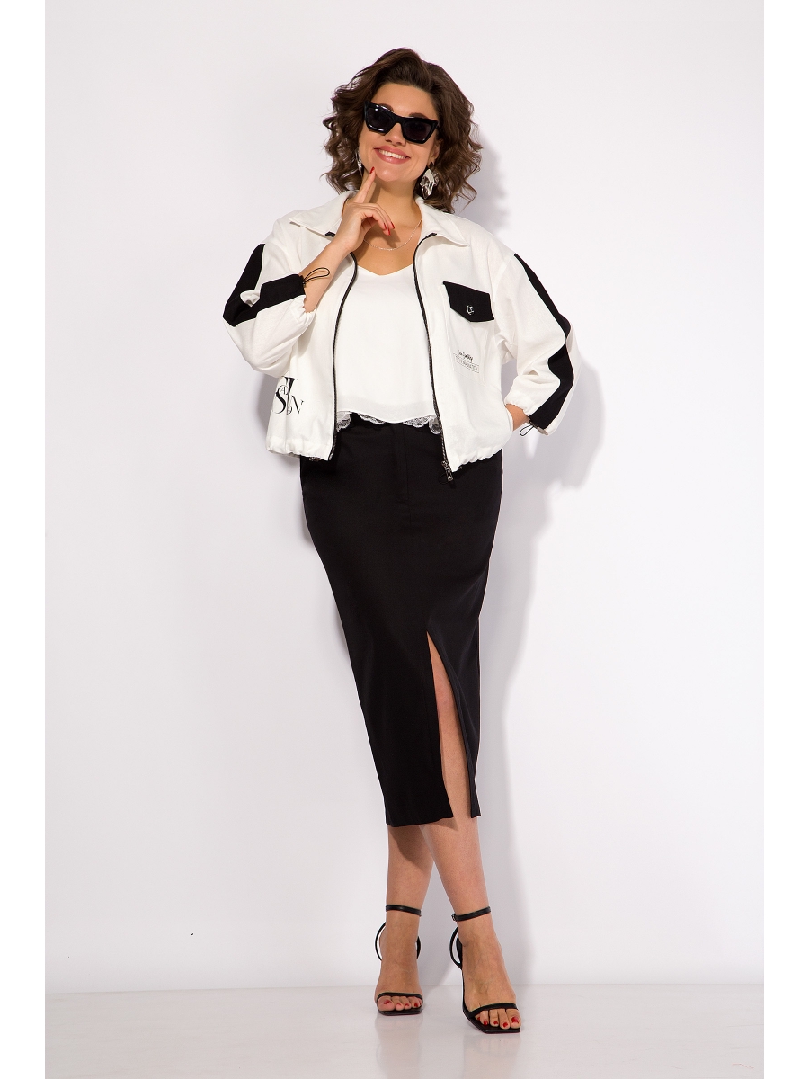 Эффектный весенне-летний жакет в стиле спорт-шик, выполнен из льна с добавлением вискозы. Модель свободного силуэта с центральной застежкой на молнию. Воротник отложной. Рукав на спущенном плечевом поясе, длиной ¾-ти. По центру рукава проходит лампас контрастного цвета. Низ рукава присборен на утяжку с регуляторами. Полочка декорирована печатью накатом и ассиметричным накладным карманом с клапаном. Оригинальная модель, отлично сочетается с однотонными брюками и юбками из базовой коллекции от бренда – ЛИЛИАНА!