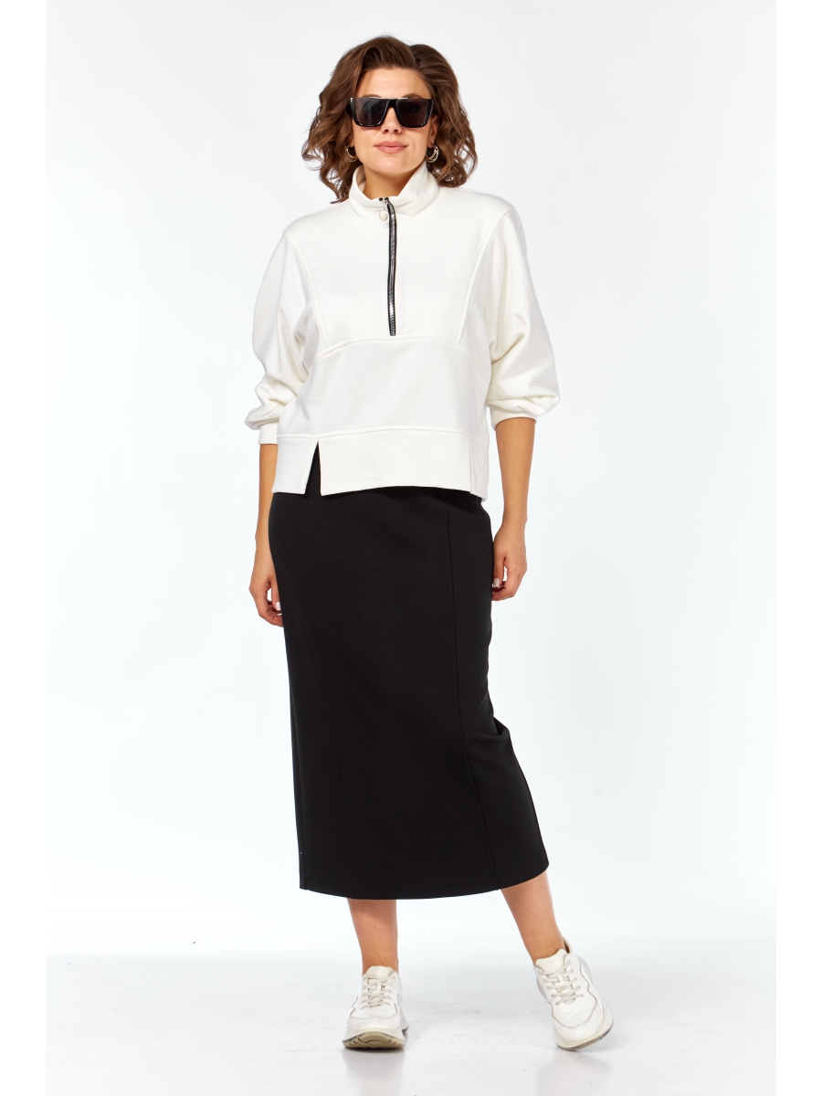 Джемпер: свободного кроя, линия плеча спущена. Воротник мягкий стойка, застёжка на металлическую тесьму молнию. Низ джемпера обработан широкой бейкой с разрезами. Спинка с декоративными подрезами и металлической нашивкой.