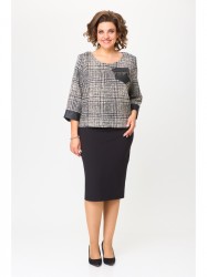Блуза свободного силуэта летучая мышь со спущенным рукавом. Горловина переда состоит из сетки и декоративной планки. Рукав заканчивается манжетой. По передней части костюма клапаны и горловина декорированы отделочной металлической цепочкой. Спинка со средним швом на обтачке. На заднем полотнище по центру потайная молния. На переднем цельнокроеная складка имитирующая планку заканчивающейся шлицей.