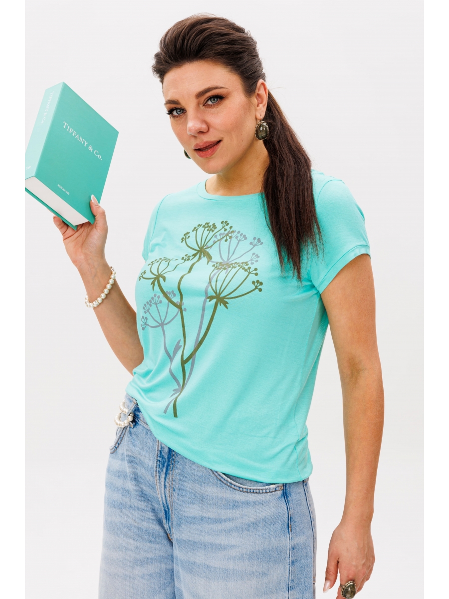 Особый шарм футболке придает необычный принт — тонкие стебли укропа, напоминающие игру света в теплице у бабушки.