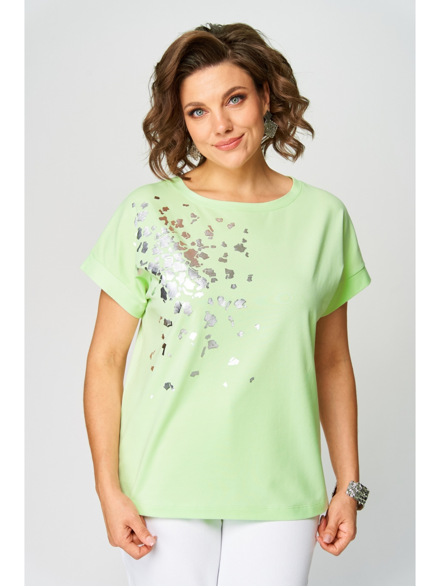 Джемпер из трикотажной хлопковой ткани, со спущенным плечом. Перед джемпера с принтом. Вырез горловины круглый, оформлен бейкой. Спинка без среднего шва.