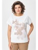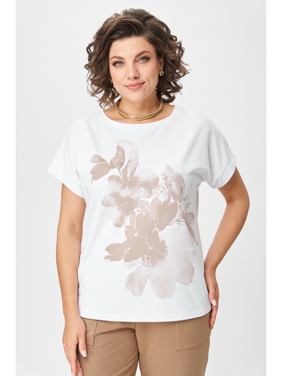 Джемпер из трикотажной хлопковой ткани. Перед футболки с принтом. Спущенное плечо, оформлено притачной манжетой. Вырез горловины круглый, оформлен бейкой. Спинка без среднего шва.