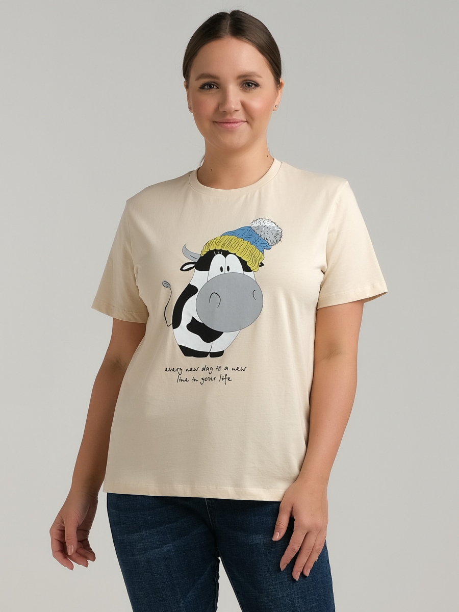 Прямая футболка с круглым вырезом горловины и коротким рукавом. По переду футболки выполнен принт "Символ года 2021".