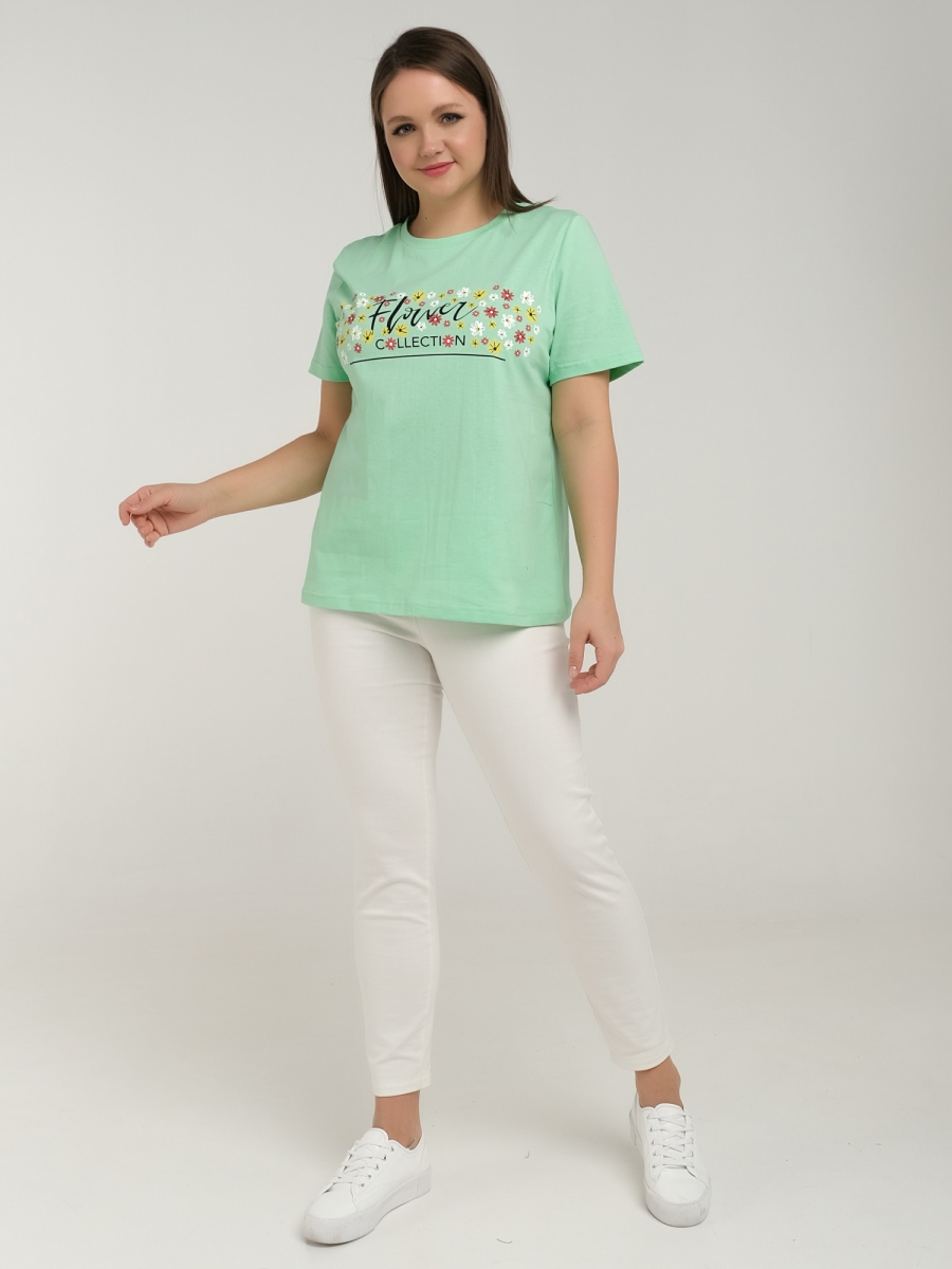 Круглый вырез горловины и короткий втачной рукав. По переду футболки выполнен цветочный принт.