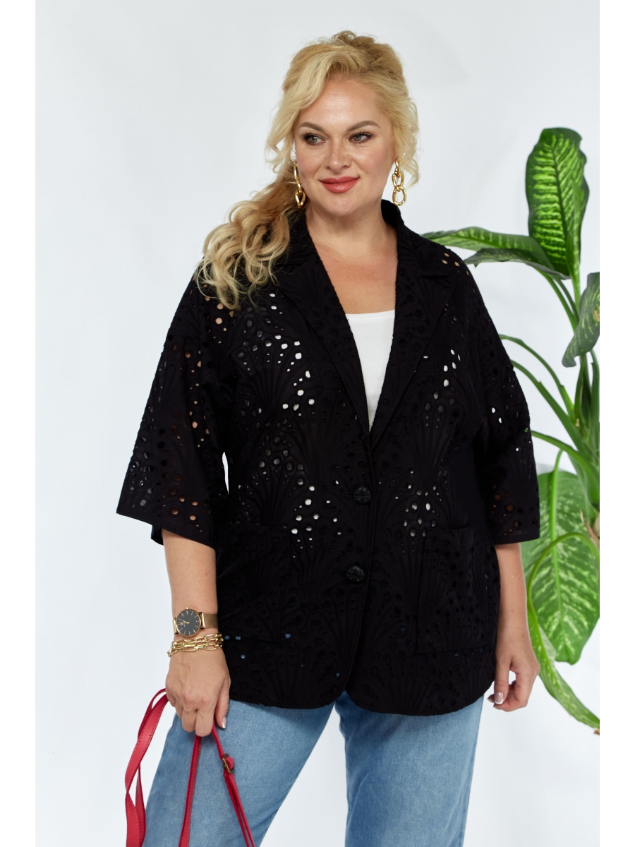Бренд белорусской женской одежды больших размеров Anastasia представляет элегантный кружевной жакет женский больших размеров. Жакет из хлопковой ткани ""шитье"", прямого силуэта со спущенным плечом. Рукав 3/4 длины. Застежка на пели и пуговицы, воротник пиджачного типа. По полочке идут накладные карманы, низ фигурный. Стильный жакет оверсайз невероятно удобный и практичный. Он идеально дополнит образ в офис с юбкой или брюками.