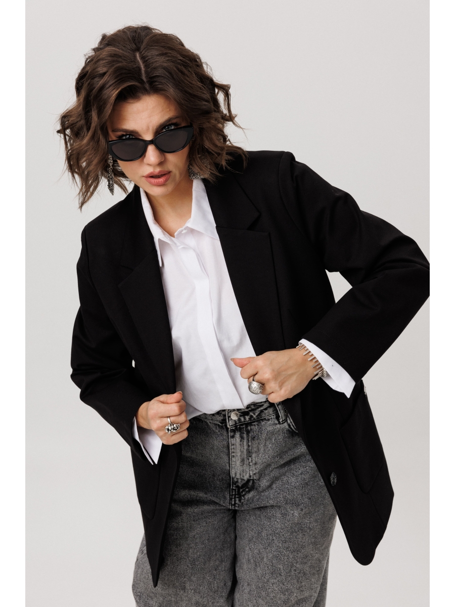 Классика с дерзким характером — этот жакет сочетает в себе строгий крой и неформальную изюминку. Прямой силуэт с однобортной застёжкой на пуговицы и пиджачным воротником с лацканами создаёт элегантную основу.
