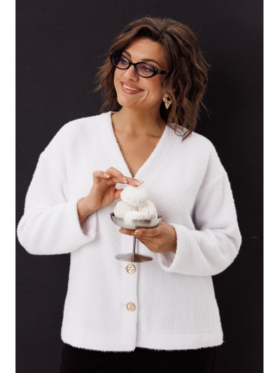 Его прямой силуэт со спущенным плечом и изящными разрезами по бокам струится легко и свободно, подчеркивая достоинства, не сковывая движений. Глубокий V-образный вырез горловины добавляет образу женственности и строгой элегантности, а классическая застежка на пуговицы завершает безупречный вид.