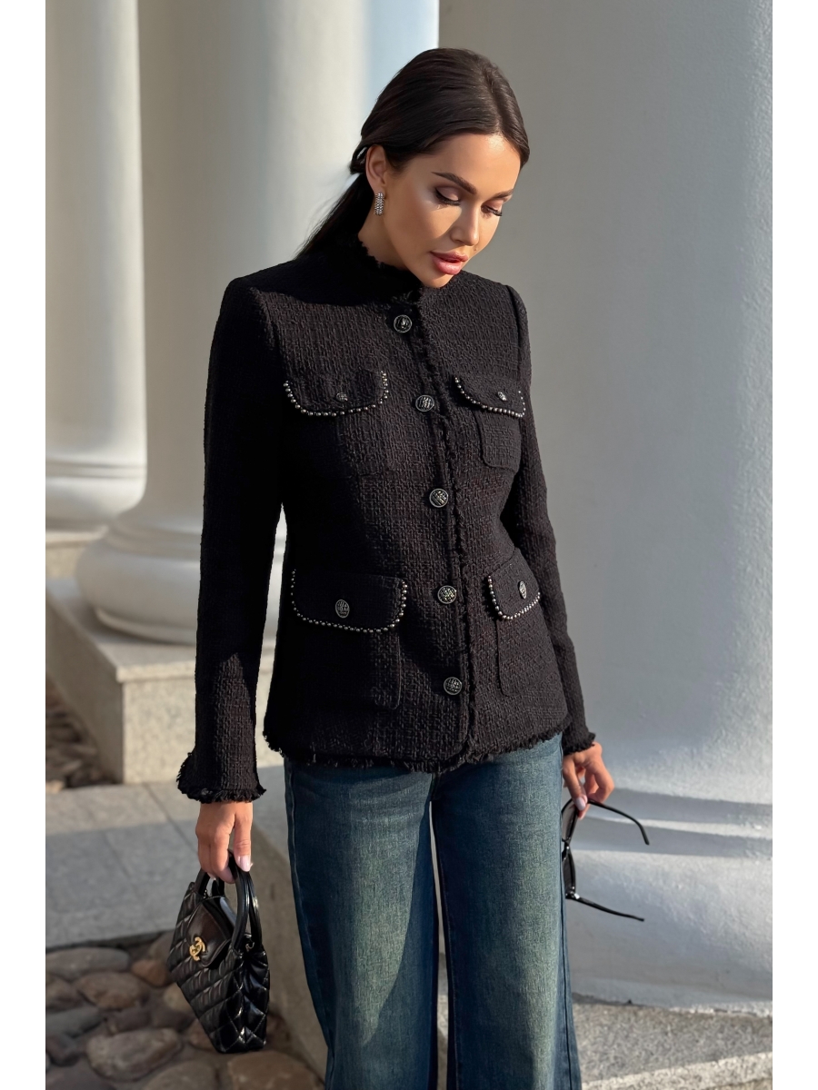 Этот жакет в стиле Шанель выполнен из черного твида, что придает ему особый шарм и элегантность. Красивая отделка и фурнитура дополняют образ, делая его еще более изысканным. Жакет идеально подойдет для создания строгого, но в то же время женственного образа. Он прекрасно сочетается с платьями и юбками, а также с джинсами и брюками. Благодаря качественным материалам и мастерству исполнения, жакет сохранит свою форму и внешний вид на долгое время. В этом жакете вы будете выглядеть стильно и уверенно в любой ситуации.