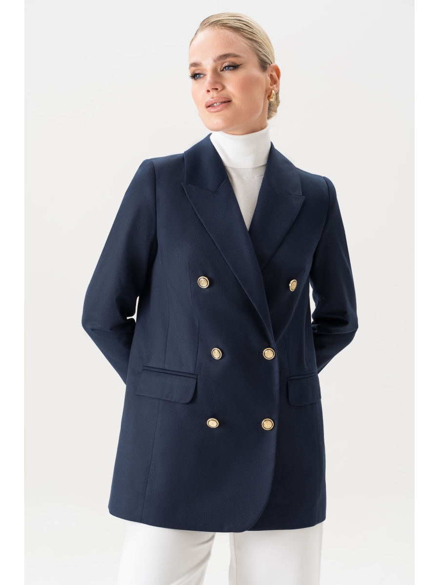 Пиджак женский удлиненный приталенный синий URS – это воплощение элегантности, стиля и практичности в одном изделии. Современные модные тенденции снова обращаются к классике, и именно поэтому женский жакет, особенно удлинённого кроя, стал настоящим must-have в гардеробе каждой женщины. Модель подчеркивает фигуру, выглядит дорого и изысканно, подходит для разных случаев – от деловых встреч до вечерних выходов. Жакет женский, свободного полуприлегающего силуэта, выполнен из костюмной ткани, на притачной подкладке, с двубортной застежкой на 2 петли и 6 декоративных пуговиц (размер и цвет фурнитуры может незначительно отличаться от фото), для повседневной носки. Перед и спинка с отрезными бочками. Перед в нижней части с прорезными карманами с клапанами и обтачками, с талиевыми вытачками, идущими от карманов вверх, с закругленными по низу бортами. Спинка со средним швом и шлицей. Рукава втачные, двухшовные, длинные. В локтевом шве по низу обработана отлетная шлица с 4-мя петлями и 4-мя декоративными пуговицами. Горловина оформлена воротником пиджачного типа. Жакет с плечевыми накладками.