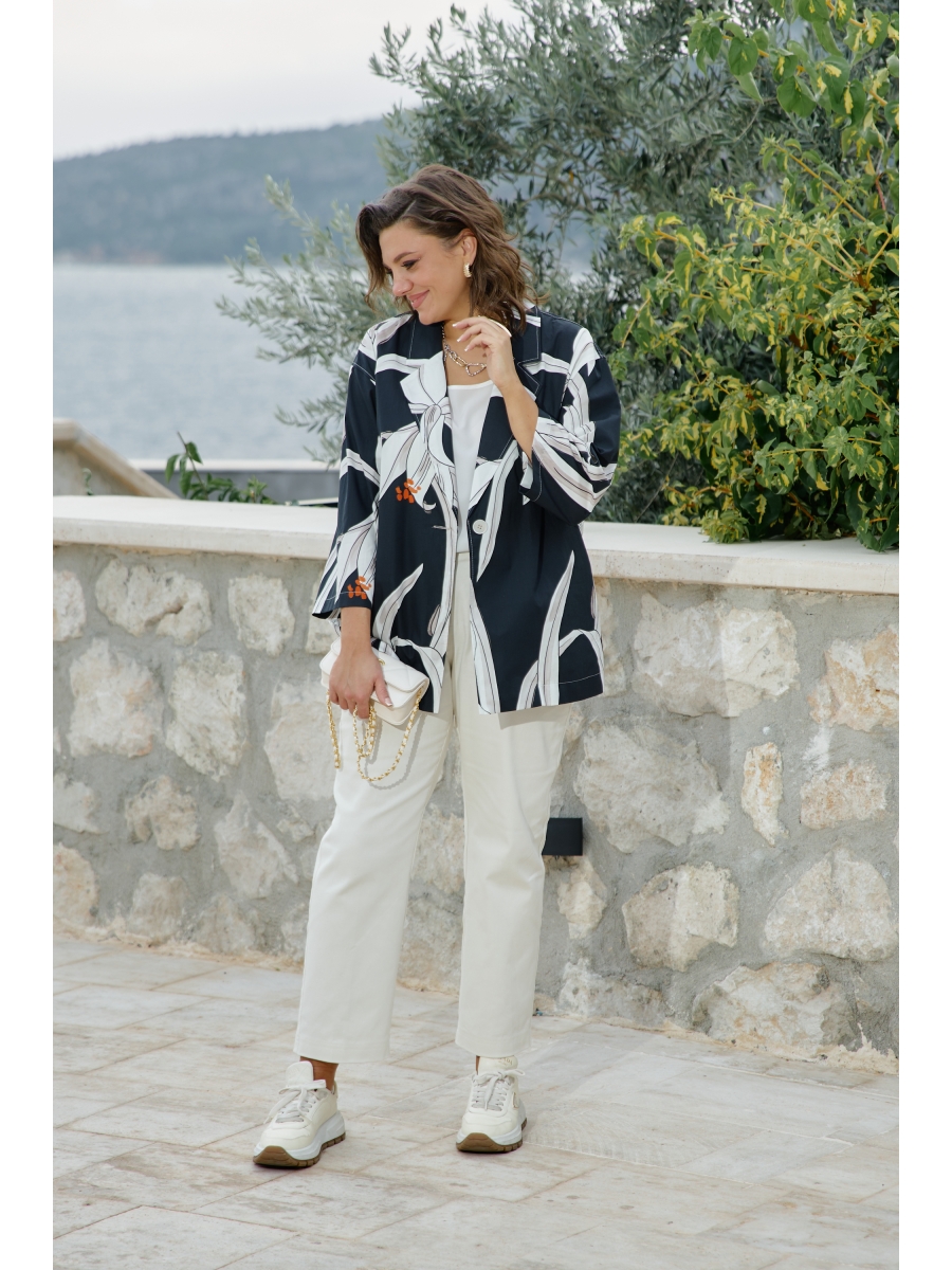 Оформить заказ →Этот жакет — история о контрастах. Тёмный, глубокий фон и лёгкий, светлый рисунок. Скрывающий силуэт покрой и откровенная, притягивающая взгляд красота принта-идеальный вариант для тех, кто любит привлекать внимание, он сочетает в себе летнюю расслабленность и деловую элегантность. Данный жакет станет отличным вариантом для повседневных образов, а также для работы в офисе. Прямой крой и сдержанный крупный принт помогут скрыть все несовершенства фигуры и создать идеальный силуэт. Жакет прямой, свободного силуэта, с центральной застёжкой на петлю-пуговицу, с отложными лацканами. Карманы - в боковых швах. Спинка жакета со средним швом. Рукав со спущенной линией плеча, длиной 3/4. Жакет без подкладки.