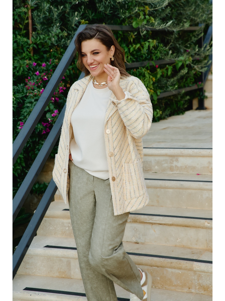 Оформить заказ →Женский жакет из трикотажного полотна в модном оттенке сливочного масла — это воплощение тепла и уюта, придающее любому образу нотку свежести и элегантности. Его мягкая текстура приятно ощущается на коже, создавая ощущение комфорта. В нем легко создать как повседневный, так и более нарядный образ. Жакет прямого силуэта однобортный на три стильные кнопки по борту. Воротник пиджачного типа с лацканами, по плечевому поясу втачная деталь "аля" погон. По переду жакета два накладных кармана. Жакет со спущенным плечом, втачной рукав внизу на манжете с застёжкой на кнопку-пуговицу. Спинка с отрезной кокеткой. Низ жакета закруглён к боковым швам.