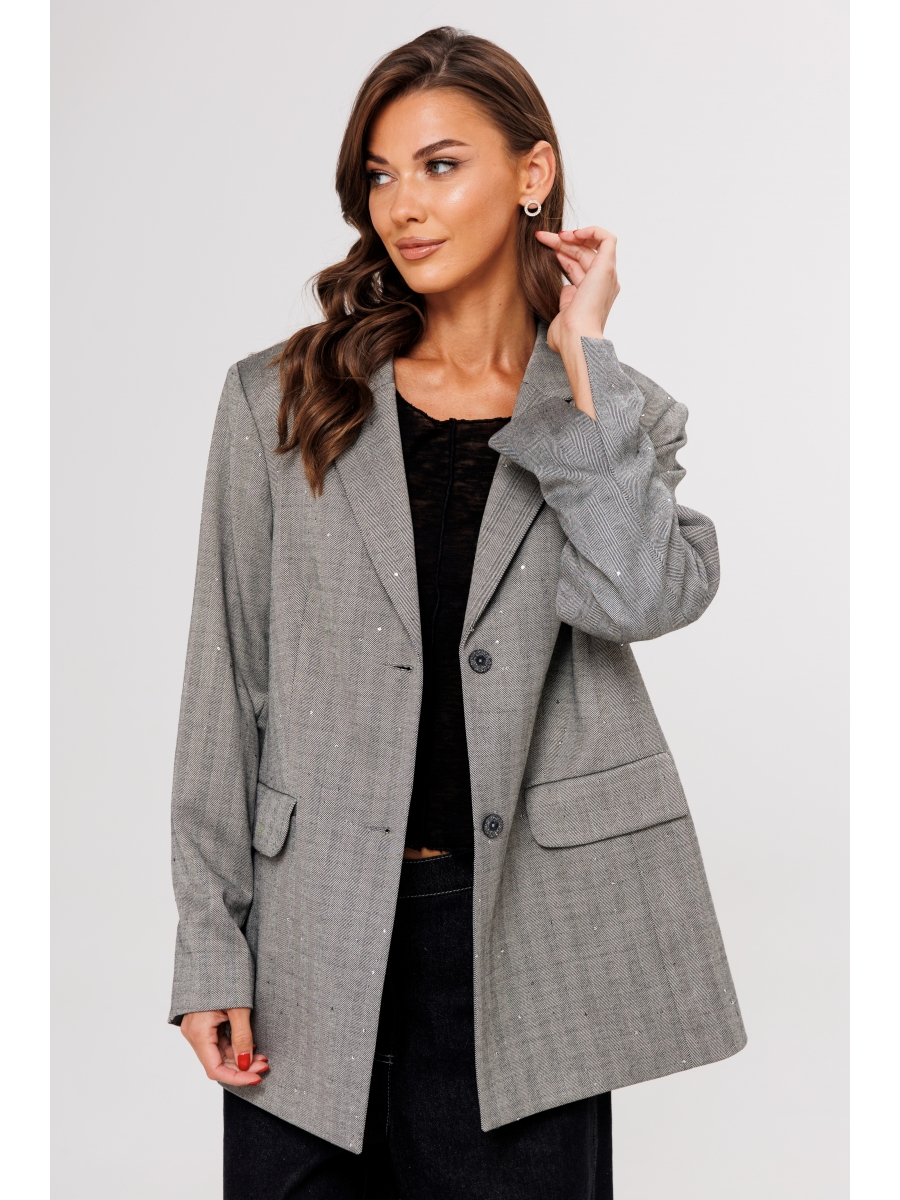 Оформить заказ →Жакет свободного расширенного силуэта, втачного покроя с центральной застёжкой и классическим английским воротником. Полочка с отрезным бочком, нагрудной вытачкой и прорезным карманом с клапаном. Спинка с центральным швом, шлицей и отрезным бочком. Рукав двухшовный с отлетной шлицей. Элегантность и нарядность жакету придает ткань в мелкую рассыпную пайетку. На фото представлены брюки от костюма 5205.