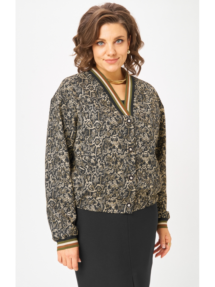 Жакет-бомбер из текстильной ткани, свободный, со спущенной линией плеча, с центральной застежкой на петли-пуговицы, на подкладке. Горловина V-образная, переходящая в стойку. Детали переда с прорезными карманами с листочкой. Спинка цельная. Рукав втачной, одношовный. По низу жакета планка с резинкой.
