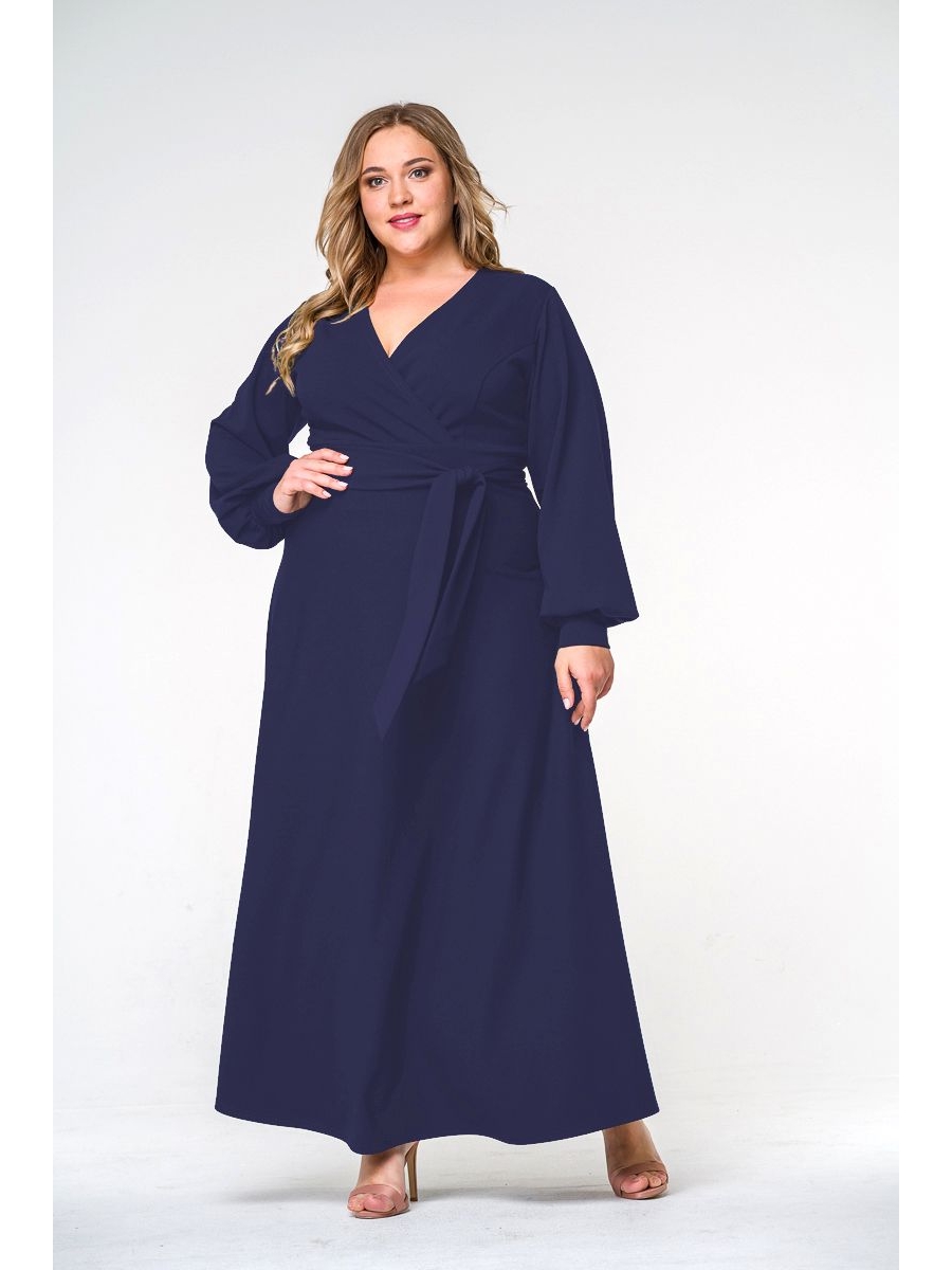 Платье длинное однотонное. Верхняя часть с запАхом, рукав длинный свободный на манжете. Линия талии подчеркнута поясом в тон платья.