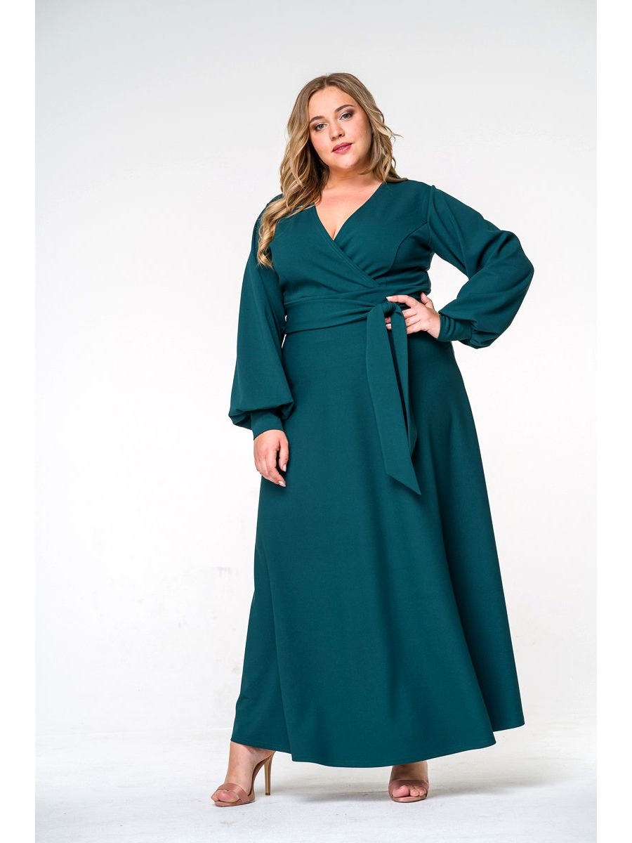 Платье длинное однотонное. Верхняя часть с запАхом, рукав длинный свободный на манжете. Линия талии подчеркнута поясом в тон платья.