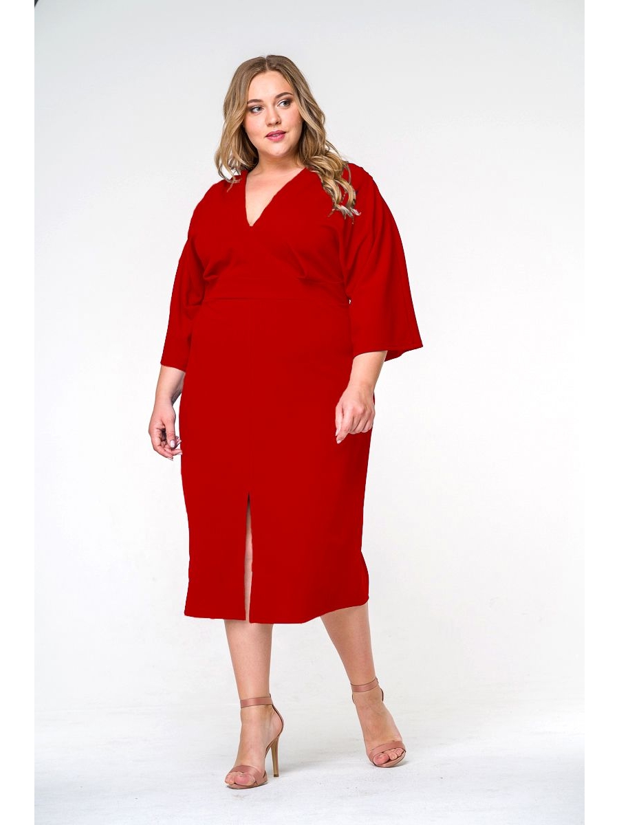 Платье с V - образным вырезом из эластичного крепа полуприлегающего силуэта. Под линией груди подрез. Рукав цельнокроеный, свободный. Нижняя часть переда с центральный швом и разрезом.