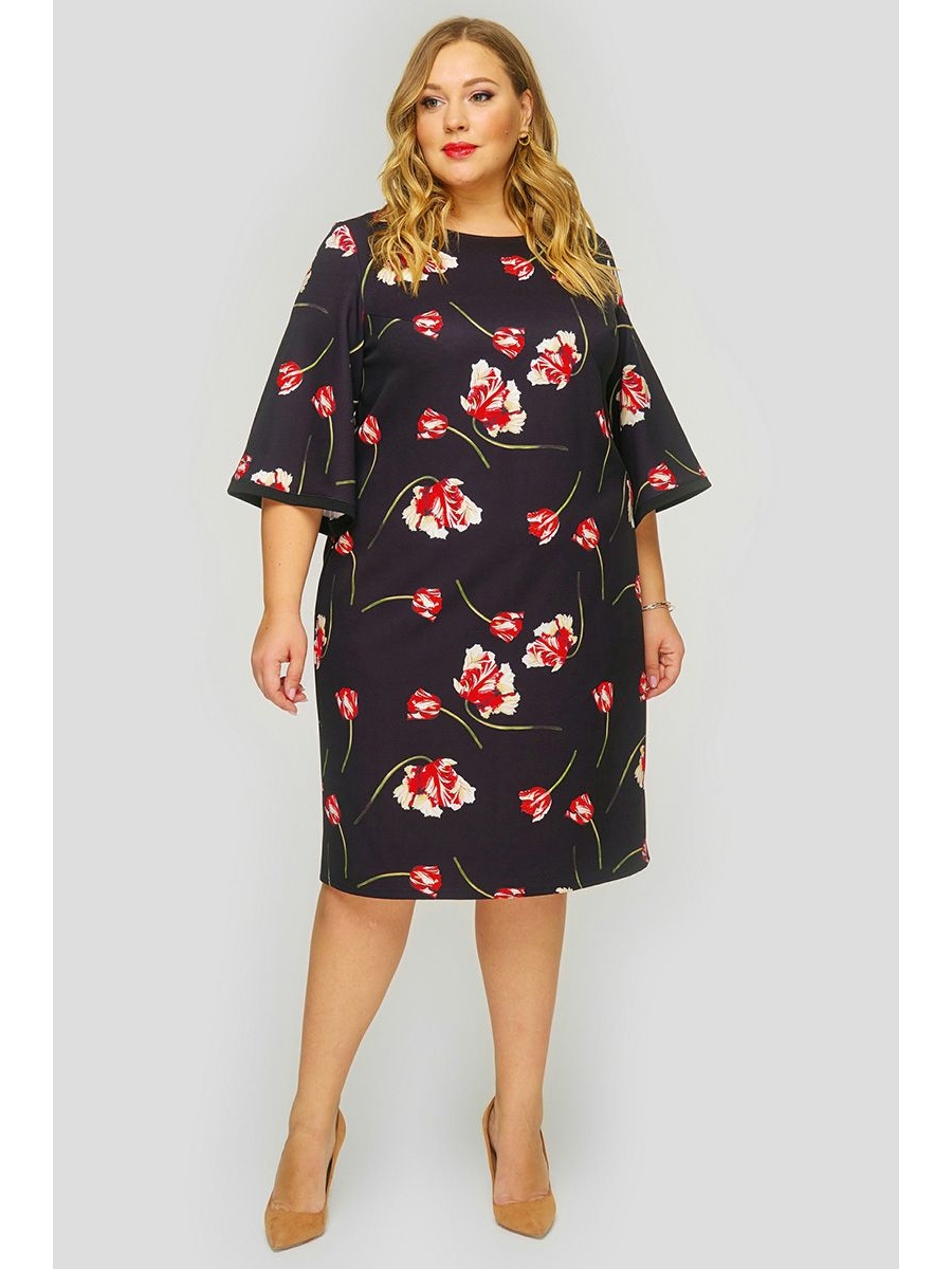 Платье полуприлегающего силуэта из крепа с эластаном. Растительный принт "тюльпаны". Рукав расширенный, отделка черная.