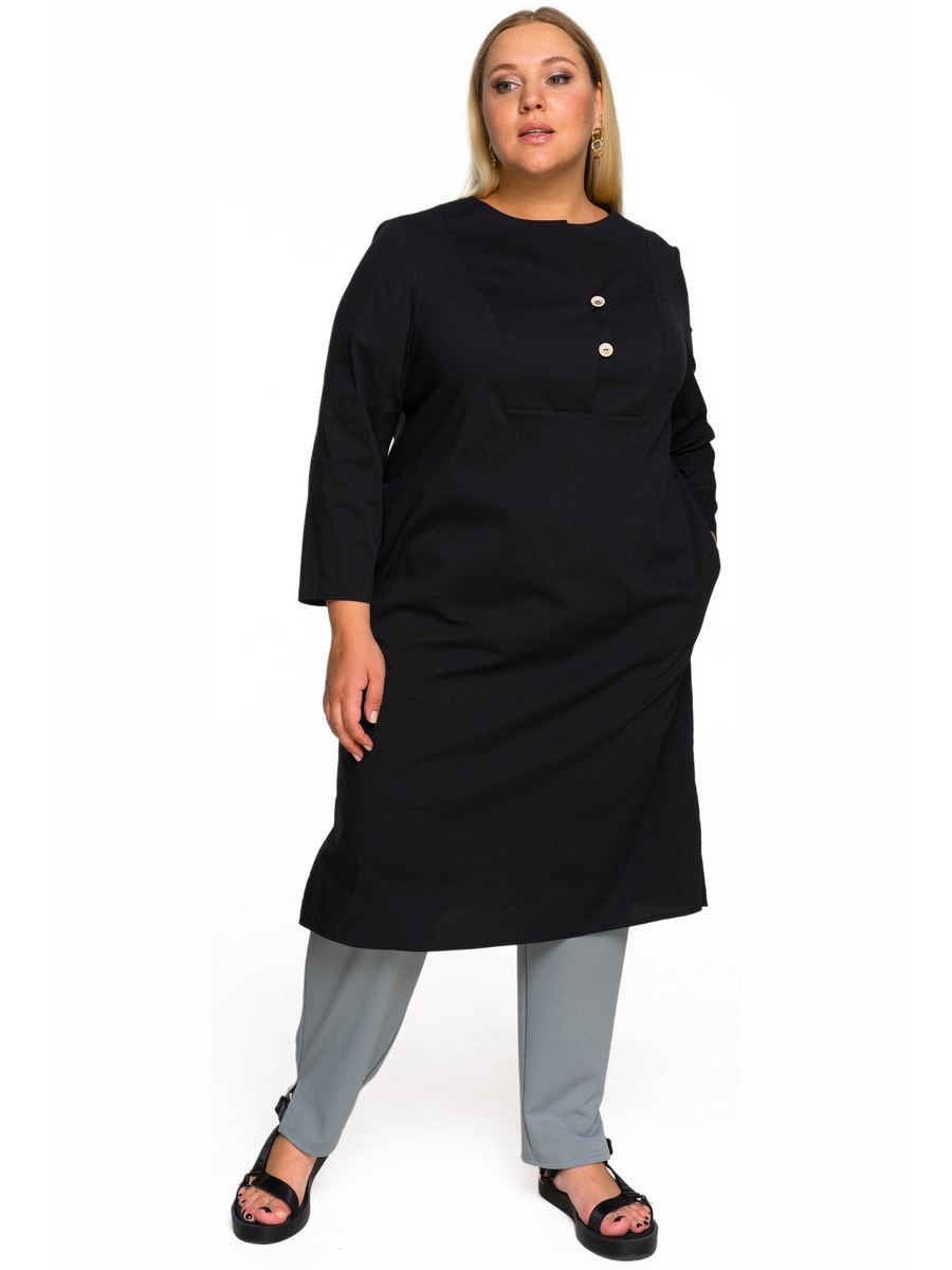 Платье- туника из хлопка с эластаном прямого силуэта. По переду вставка - кокетка застегивающаяся на 2 пуговицы. Вырез горловины округлый. В боковых швах карманы.