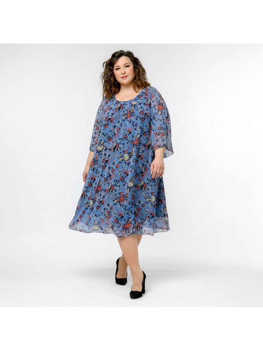 Воздушное платье силуэта трапеция из шифона с расклешенным рукавом. По горловине переда заложены защипы.