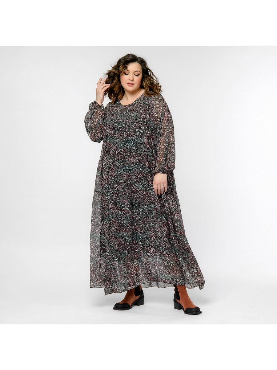 Платье длинное из шифона на подкладке свободного силуэта. Отрезное по линии груди, нижняя часть платья присборена. Рукав длинный, низ рукава на резинке .Вырез горловины округлый.