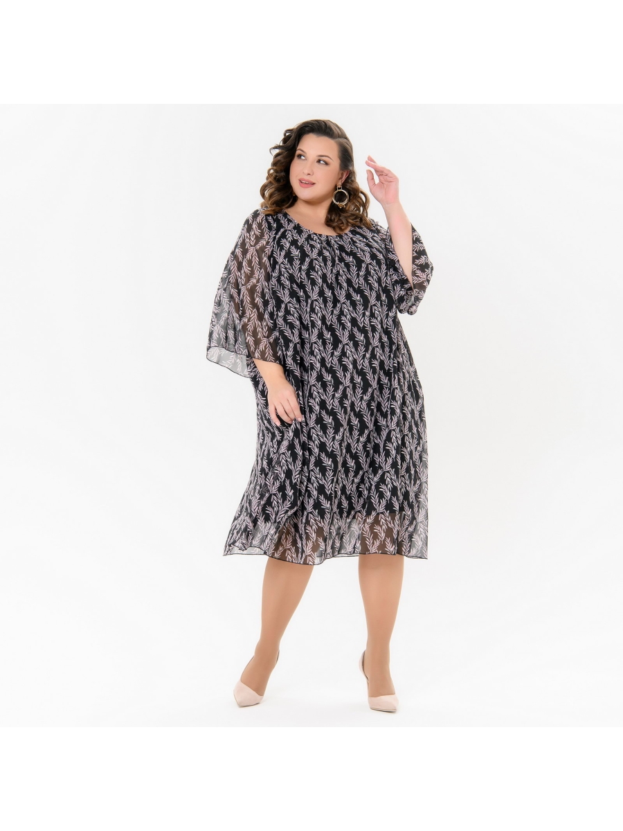 Воздушное платье силуэта трапеция из шифона с расклешенным рукавом. По горловине переда заложены складочки.
