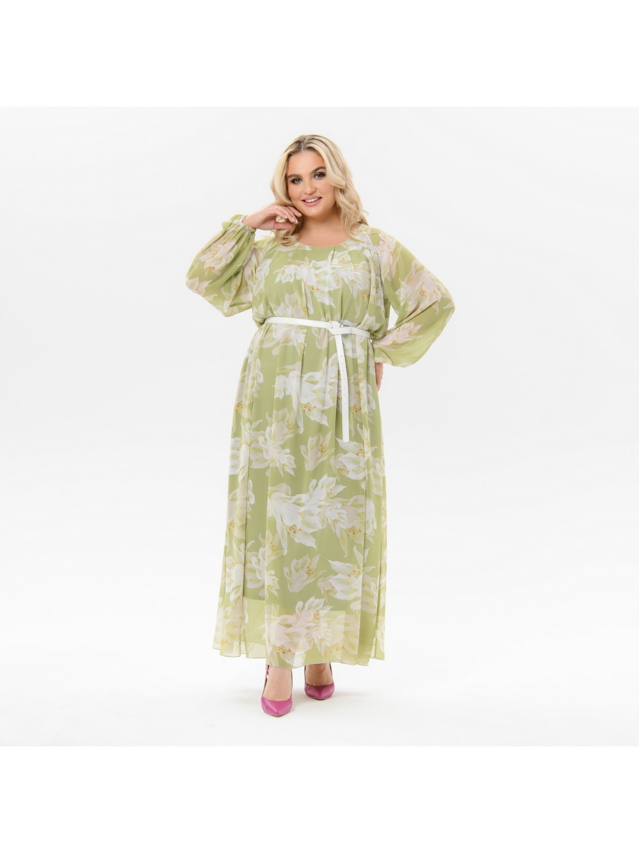Длинное струящееся платье с рукавом реглан. Модель выполнена из шифона, на подкладке из эластичного трикотажа. Горловина округлая с мягкими складками по переду, по спинке вырез "капелька", застегивающийся на пуговицу.