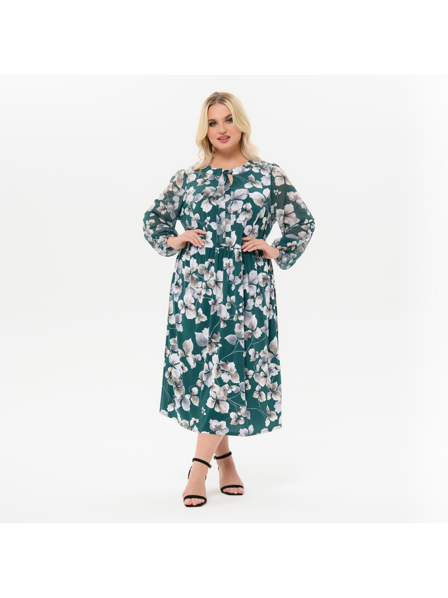 • Название: Платье комбинированное, основа "масло", рукава шифон-компаньон, принт цветочный, фон изумрудный