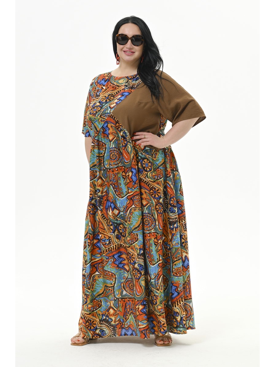 Платье длинное, свободного силуэта, из штапеля. Нижняя часть платья отрезная, присборенная. Линия подреза по переду фигурная, по спинке горизонтальная.