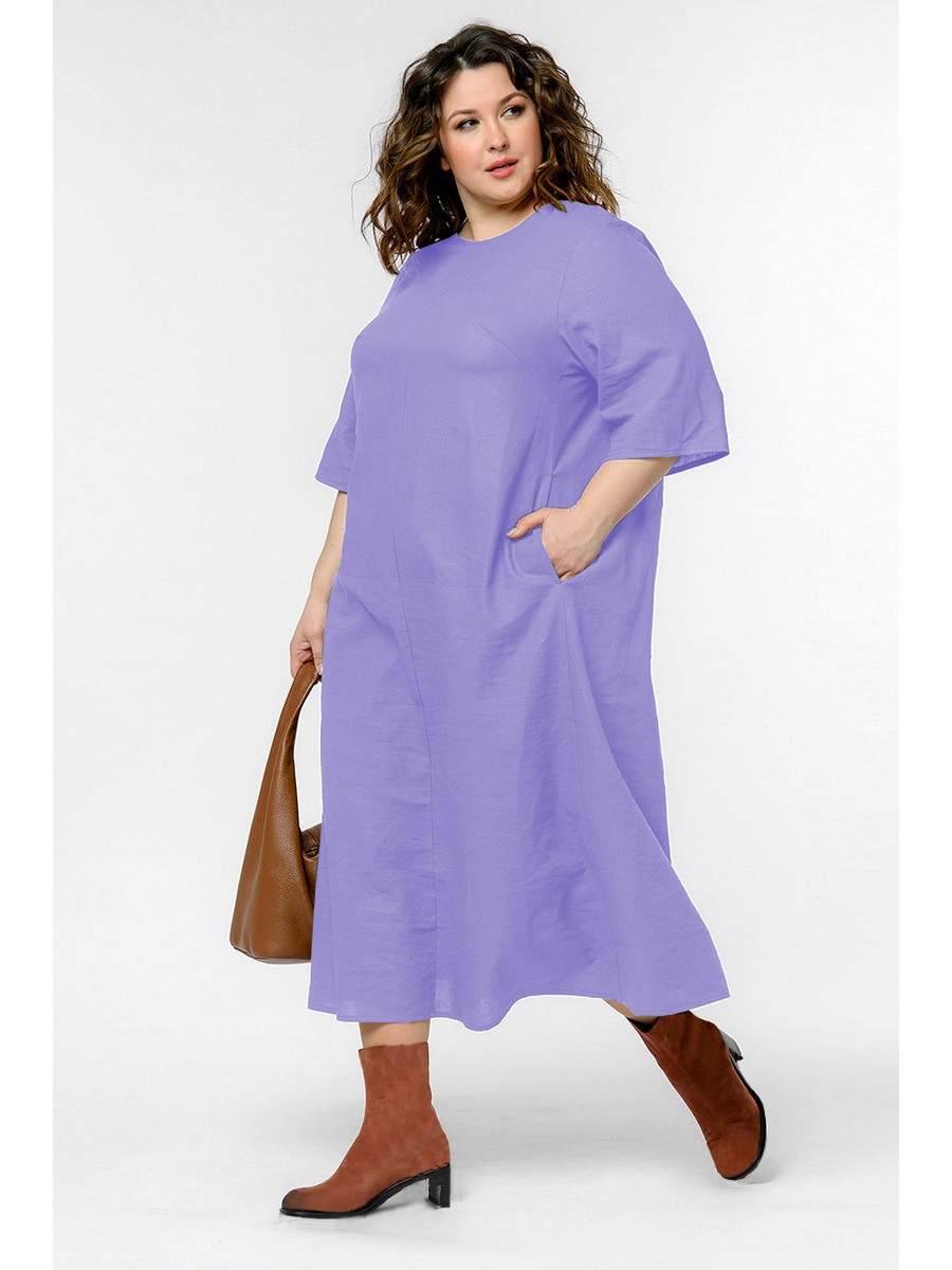 Платье свободного силуэта, из смесовой ткани, содержащей в составе лен и вискозу. Боковые швы смещены на переднюю половинку платья, в них обработаны карманы. Рукав втачной, свободный. Основным декоративным элементом является вырез горловины на спинке,в который вставлена резинка, образующая сборочку.