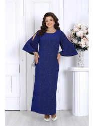 Платье женское полуприлегающего силуэта, выполнено из трикотажного полотна с фактурной лицевой стороной «люрекс». Модель на трикотажной подкладке, без застежки и плечевых накладок. Перед платья с нагрудными вытачками, направленными от проймы. Спинка с талиевыми вытачками и разрезом в нижней части среднего шва. Края V-образной горловины спинки фиксируются тремя перемычками из основного материала; горловина переда круглой формы. Рукав трехчетвертной, расширенный, с вырезом «капля» от плеча. Длина платья -- 144 см; длина рукава - 49 см.