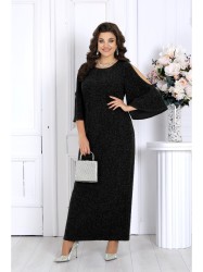 Платье женское полуприлегающего силуэта, выполнено из трикотажного полотна с фактурной лицевой стороной «люрекс». Модель на трикотажной подкладке, без застежки и плечевых накладок. Перед платья с нагрудными вытачками, направленными от проймы. Спинка с талиевыми вытачками и разрезом в нижней части среднего шва. Края V-образной горловины спинки фиксируются тремя перемычками из основного материала; горловина переда круглой формы. Рукав трехчетвертной, расширенный, с вырезом «капля» от плеча. Длина платья -- 144 см; длина рукава - 49 см.