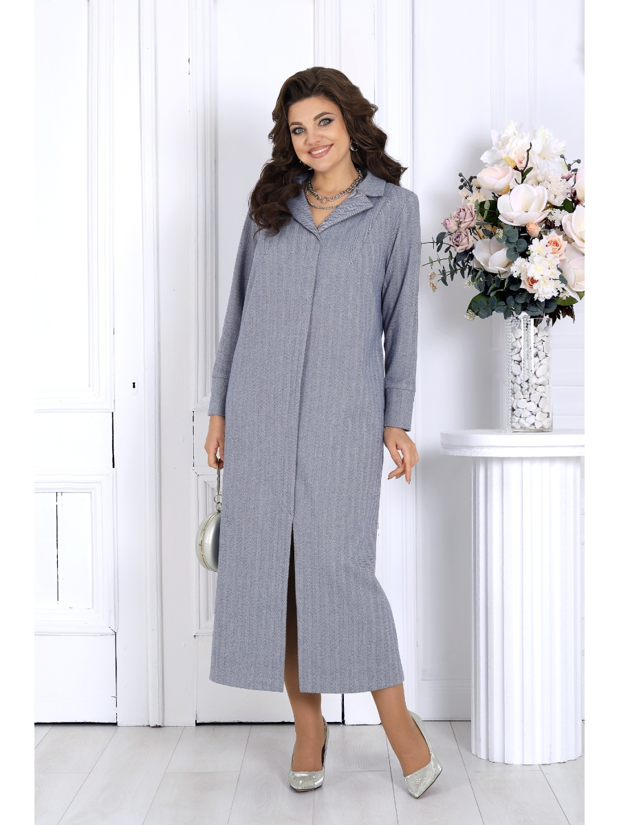 Платье женское прямого силуэта, выполнено из трикотажного полотна «елочка». Модель без подкладки, без застежки. В боковых швах платья обработаны карманы. По переду – имитация потайной бортовой застежки; от плечевых швов к центру груди направлены вытачки. Спинка со средним швом. Воротник пиджачного типа. Рукав втачной, длинный, с притачной, замкнутой манжетой по низу. Длина платья – 123 см.; длина рукава – 59 см