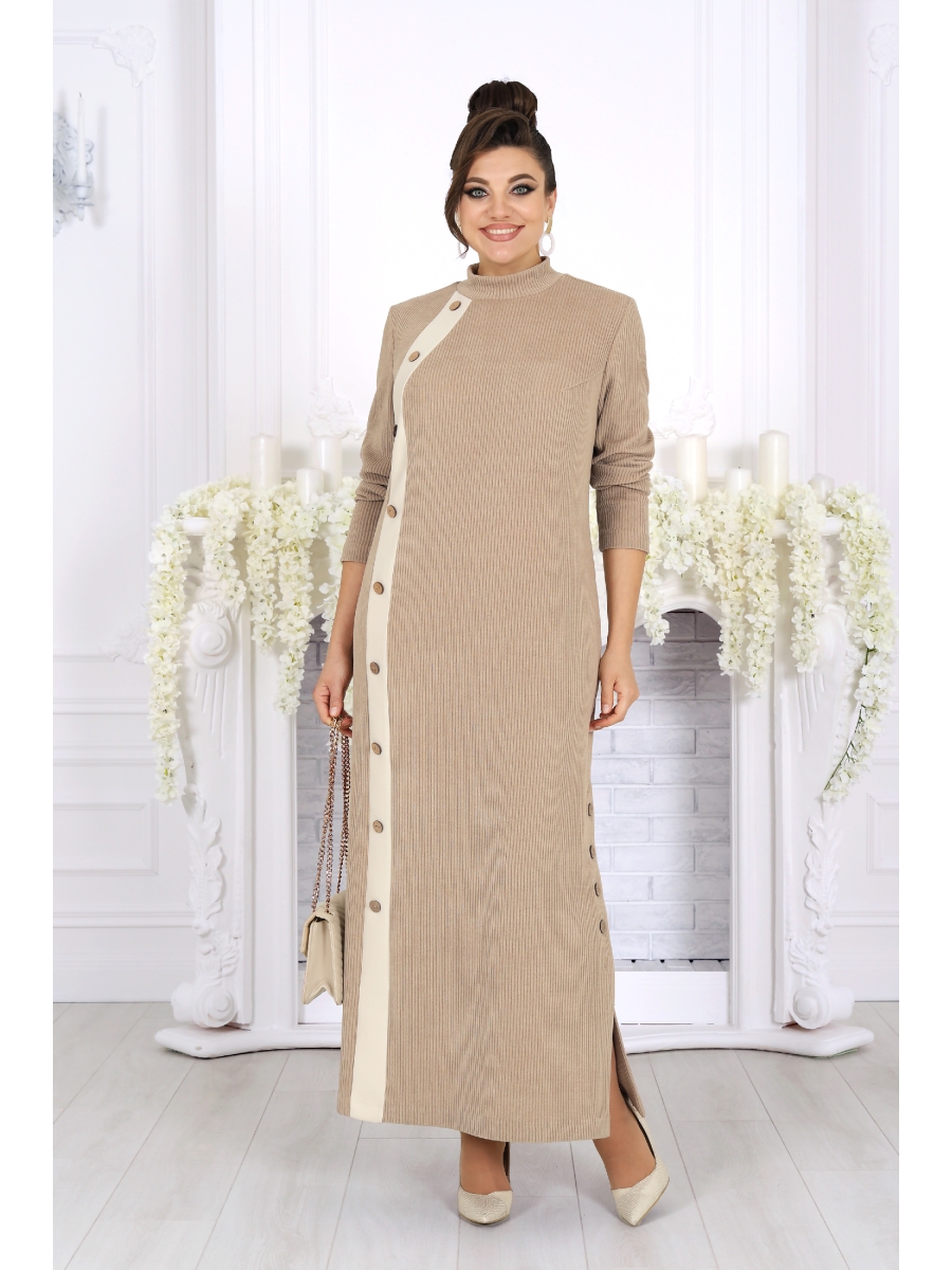 Платье женское полуприлегающего силуэта, выполнено из фактурного трикотажного полотна с рубчиком. Модель без подкладки, без застежки и плечевых накладок. В левом боковом шве обработана шлица с застежкой на 5 петель и 5 декоративных пуговиц. Перед платья асимметричный: с нагрудной вытачкой на левой части переда и планкой с декоративными пуговицами на правой; планка выполнена из гладкого отделочного трикотажного полотна.
