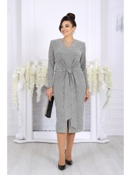 Платье женское, приталенного силуэта, выполнено из трикотажного полотна с фактурной лицевой стороной «люрекс». Модель без застежки, на трикотажной подкладке, с плечевыми накладками. Перед платья с разрезом в среднем шве и горизонтальным подрезом по линии талии; лиф цельнокроеный с поясами, завязывая которые разными способами, можно изменять внешний вид модели. На спинке обработаны талиевые вытачки. Горловина V-образной формы спереди и округлой по спинке. Рукав втачной, длинный. Длина платья – 113 см; длина рукава – 57 см.