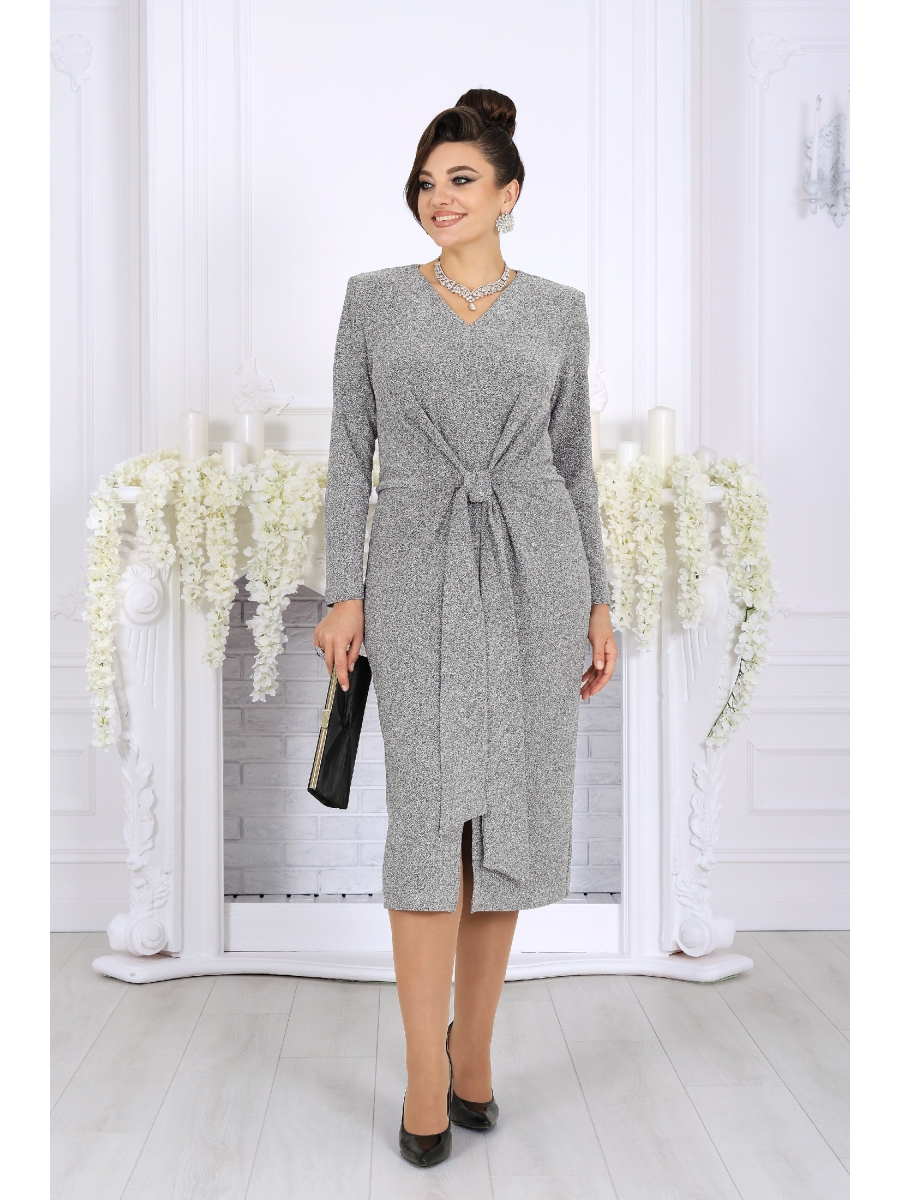 Платье женское, приталенного силуэта, выполнено из трикотажного полотна с фактурной лицевой стороной «люрекс». Модель без застежки, на трикотажной подкладке, с плечевыми накладками. Перед платья с разрезом в среднем шве и горизонтальным подрезом по линии талии; лиф цельнокроеный с поясами, завязывая которые разными способами, можно изменять внешний вид модели. На спинке обработаны талиевые вытачки. Горловина V-образной формы спереди и округлой по спинке. Рукав втачной, длинный. Длина платья – 113 см; длина рукава – 57 см.