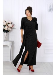 Платье женское полуприлегающего силуэта, выполнено из трикотажного полотна с фактурной лицевой стороной «люрекс». Модель на трикотажной подкладке, с плечевыми накладками. В левом боковом шве обработана застежка на потайную тесьму-«молнию» (35 см). Перед платья с горизонтальным подрезом по линии талии и отлетной деталью в шве подреза. В правой части переда обработан рельеф с разрезом в нижней части. Вдоль рельефного шва заложены односторонние складки, направленные к центру переда. Спинка с талиевыми вытачками. Горловина спинки округлая, по переду V-образная, углубленная. Рукав короткий, втачной, формы «крылышко на запах», со скругленными краями. Платье дополнено съемным «цветком» из основного полотна. Длина платья - 136 см; длина рукава - 31 см.