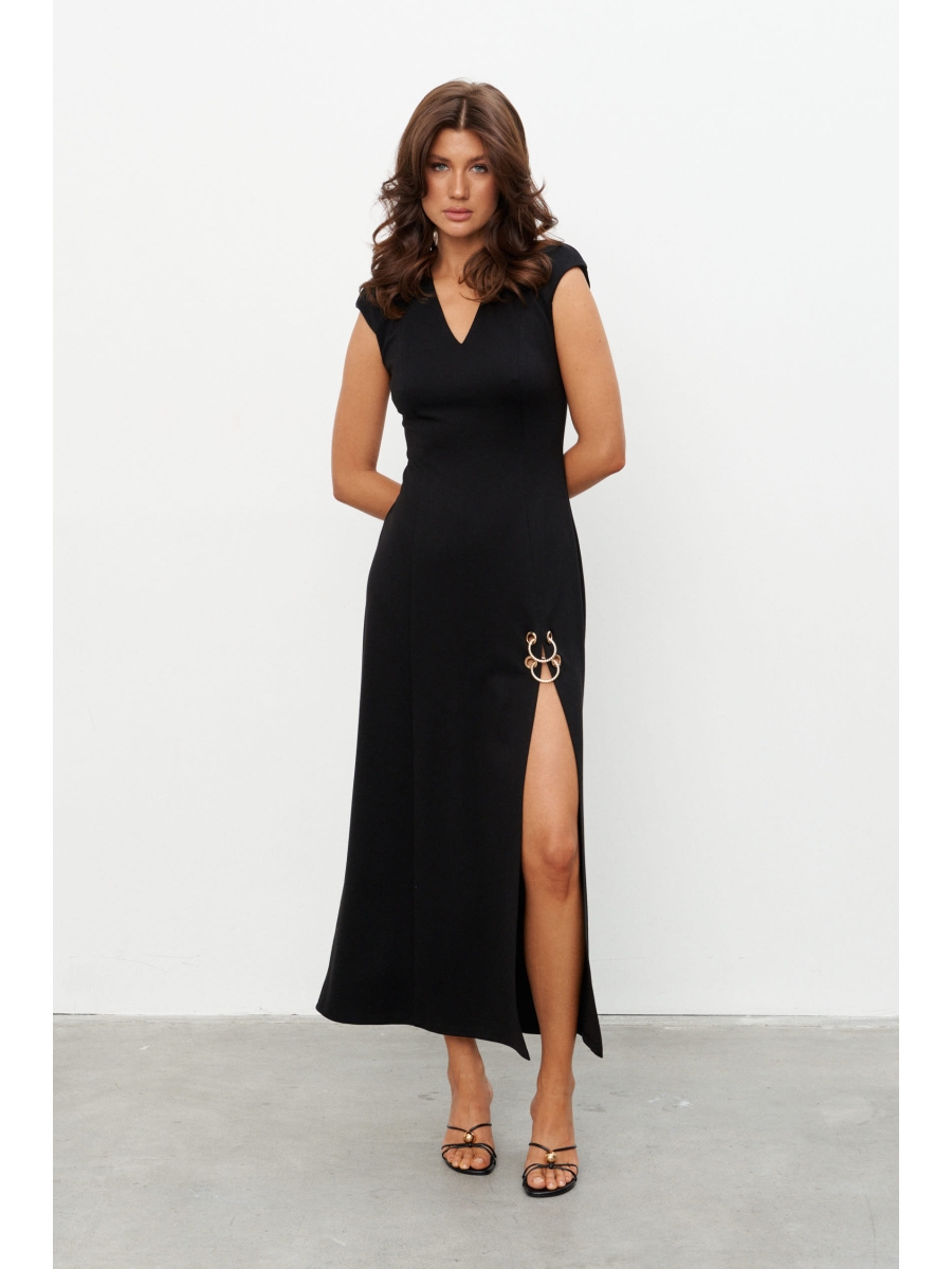 Платье из трикотажного полотна приталенного силуэта с расклешённой юбкой с высоким разрезом. Вырез горловины V-образный. По плечам - плечевые накладки. Верх разреза отделан люверсами и кольцами в качестве декора. Застёжка на потайную молнию сзади.