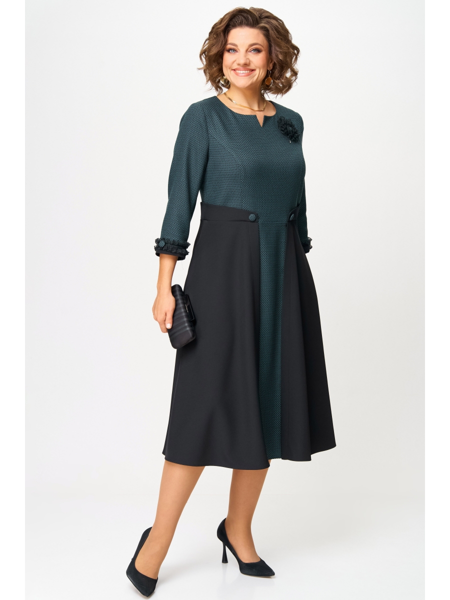 Платье полуприлегающего силуэта, отрезное по линии талии. Горловина с фигурным вырезом, обработана обтачкой. По переду лифа — рельефные швы. По спинке лифа талиевые вытачки и средний шов, в котором обработана потайная молния. Юбка платья ""клеш"", с вертикальной вставкой по переду и средним швом по спинке. Подрез по талии закрывается декоративным поясом с пуговицами. Добавят комфорта при носке функциональные карманы в боковых швах. Рукав втачной прямой, длиной ¾, по низу — манжет, декорированный тесьмой и пуговицей.