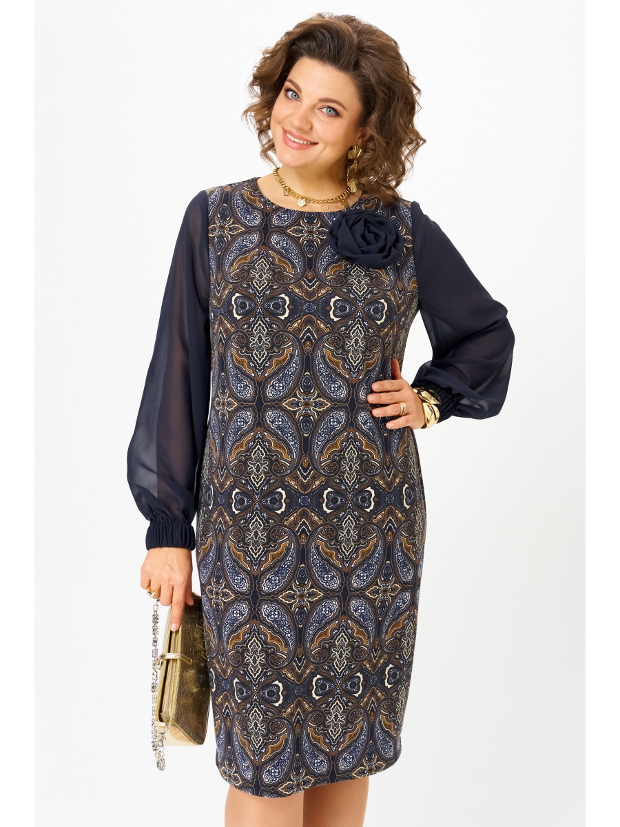 Платье полуприлегающего силуэта с округлой горловиной. Перед с нагрудными вытачками. Спинка с талиевыми вытачками, застежкой молнией и разрезом в среднем шве. Рукав втачной прямой длинный, на резинке по низу.