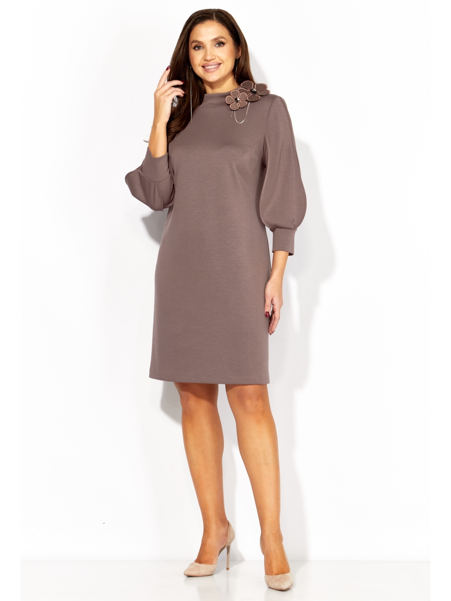 Платье женское, А-силуэта с втачным рукавом, длинной 3/4. Рукав фантазийной формы, типа "фонарик" состоящий из четырех деталей. Швы рукава отстрочены стройкой "на ребро" По переду нагрудные вытачки из пройм. Горловина оформлена расширенной, мягкой строчкой.