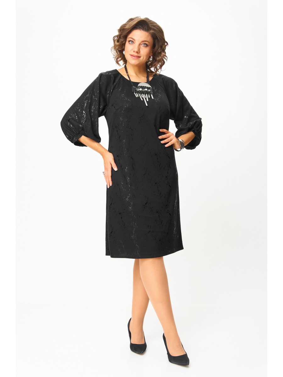 Нарядное женское платье из трикотажного полотна с добавлением вискозы. Нарядность платью придает блестящий рисунок в тон основного цвета. Силуэт прямой, длина чуть ниже колена, вырез горловины круглый с застежкой на потайную молнию в среднем шве по спинке, рукав реглан 3/4 с фигурным манжетом и сборкой по низу.