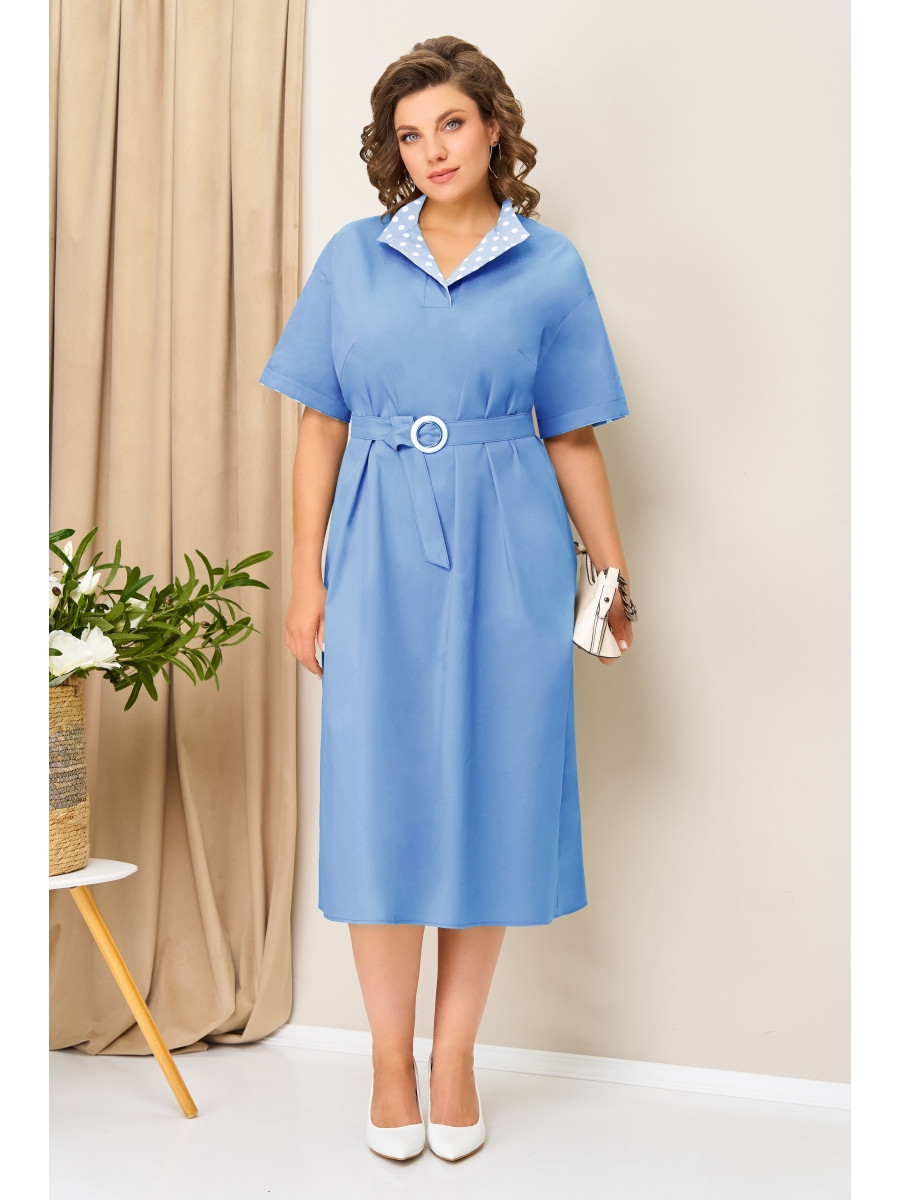 Оформить заказ →Нарядно-повседневное платье А-силуэта из хлопкового текстиля со спущенным коротким рукавом. Воротник платья-полустойка с отделкой из ткани с рисунком горох.