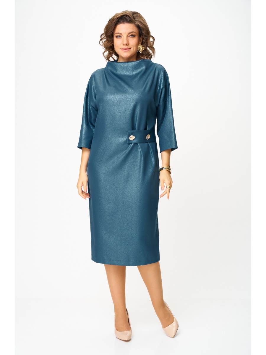 Оформить заказ →Нарядное женское платье из плательной ткани с легким блеском. Силуэт прямой, длина чуть ниже колена, с невысокой цельнокроеной стойкой. Линия плеча слегка опущена, рукав 3/4, по переду ассиметричные складки на уровне талии, с отлетной деталью в виде пояса, украшенного большими декоративными пуговицами, по спинке в среднем шве разрез.