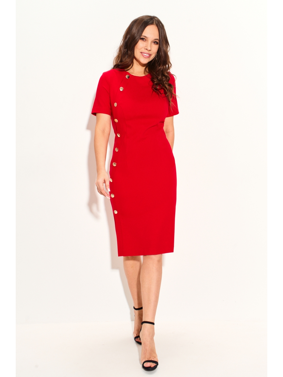 Платье женское прилегающего силуэта выполнено из трикотажного полотна средней плотности, рукава втачные, по переду планка, застежка на петли и пуговицы. Платье полностью соответствует заявленному размеру. Пожалуйста, пользуйтесь таблицей замеров готового изделия.