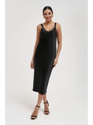 Женское шелковое платье-комбинация на бретелях длины миди. Платье выполнено "по косой" из плотного, держащего форму шелк-сатина без подкладки. В бокой шов вшита потайная молния.