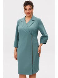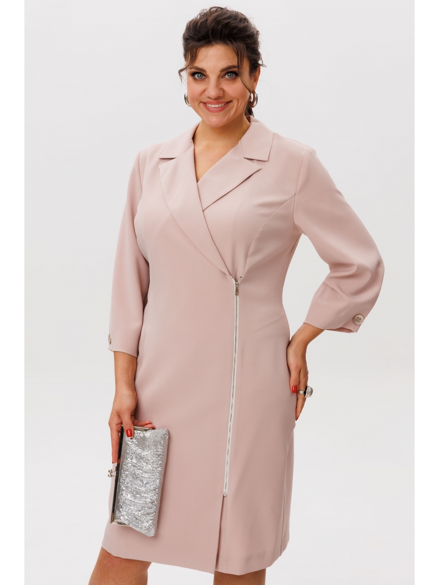 Вертикальные рельефы, идущие от проймы по переду и спинке, подчёркивают изящные линии фигуры, придавая платью лаконичную выразительность. Двубортная застёжка с отложными лацканами и воротником добавляет благородную строгость, а асимметричная молния вносит современную деталь, делая образ динамичным. Рукава длиной три четверти со складкой по низу дополняют силуэт лёгкой воздушностью.