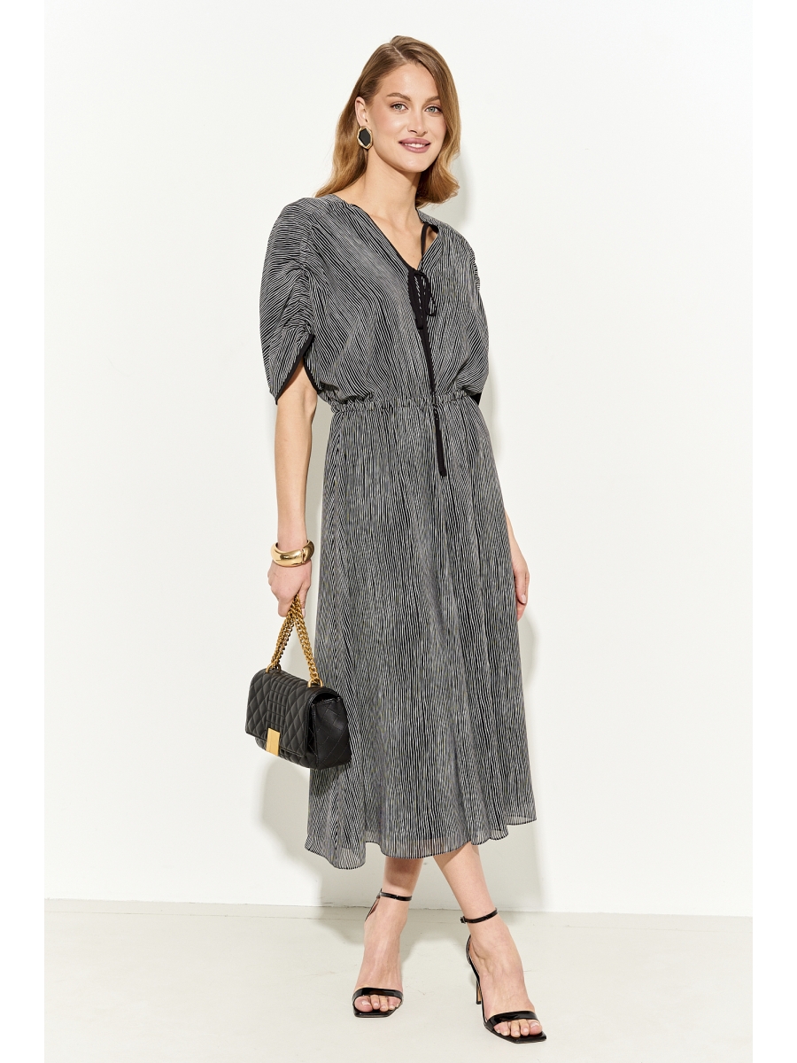 Платье женское полуприлегающего силуэта из шифона на подкладке. Перед платья с цельнокроенными рукавами и функциональной кулисой - завязкой; спинка и полочка имеет V-образный вырез горловины; по линии талии вставлена резинка; низ рукава обработан отделочной тесьмой. Верх платья можно регулировать по вашему желанию. Платье полностью соответствует заявленному размеру.